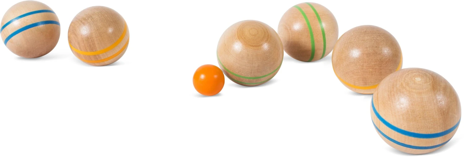 Dieses fröhliche Set ist aus einer schönen Holzsorte hergestellt. Wer kommt am dichtesten an den kleinen Ball heran?