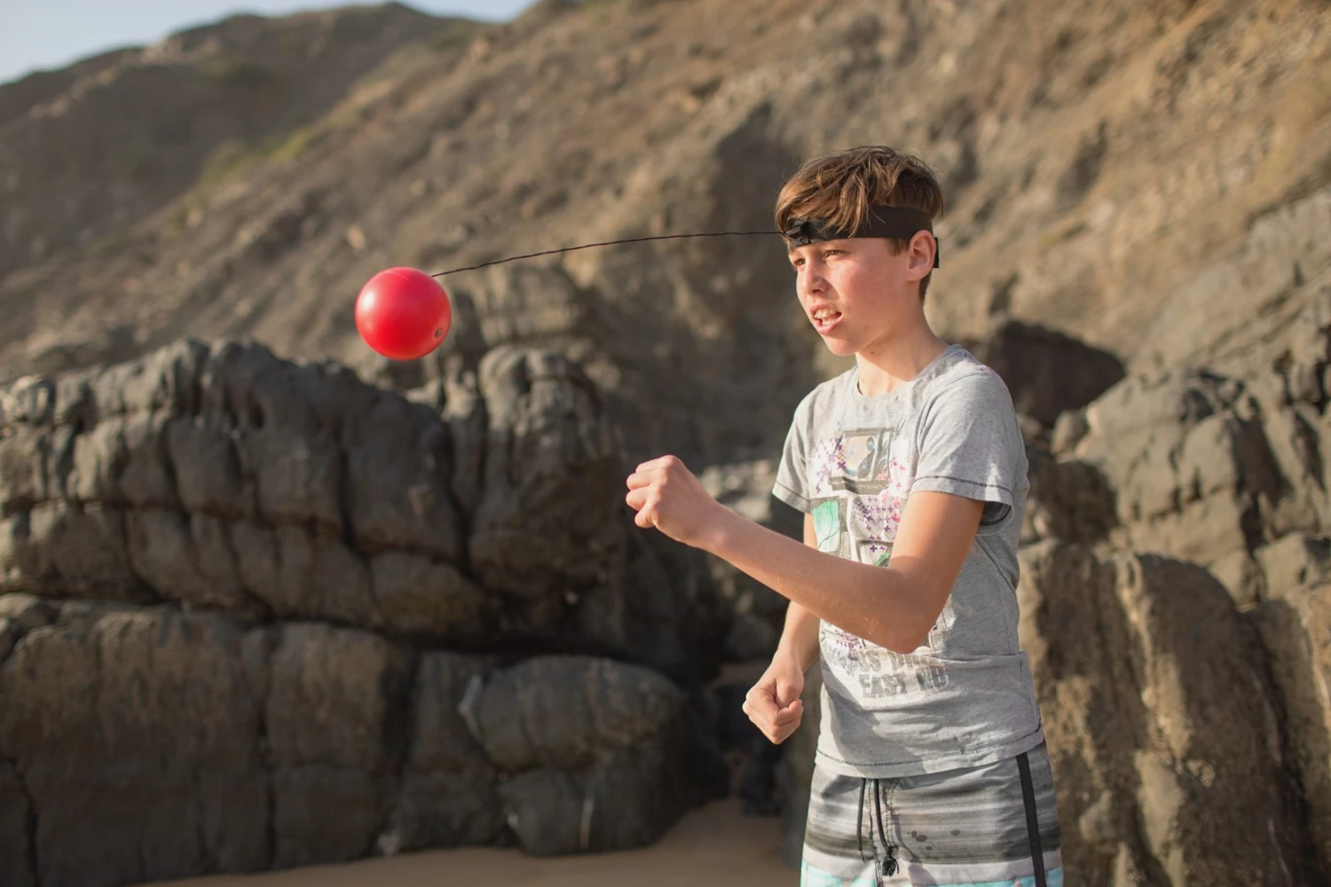 Trainiere deine Auge-Hand-Koordination und deine Reflexe. Lege das Band um deinen Kopf. Versuche nun, den Ball so oft hintereinander zu boxen, wie du kannst. Der Ball kehrt aufgrund der Elastizität zu dir zurück. Je härter du also schlägst, desto härter kehrt der Ball zurück. Kannst du deine Reflexe trainieren und den Ball unter Kontrolle halten?