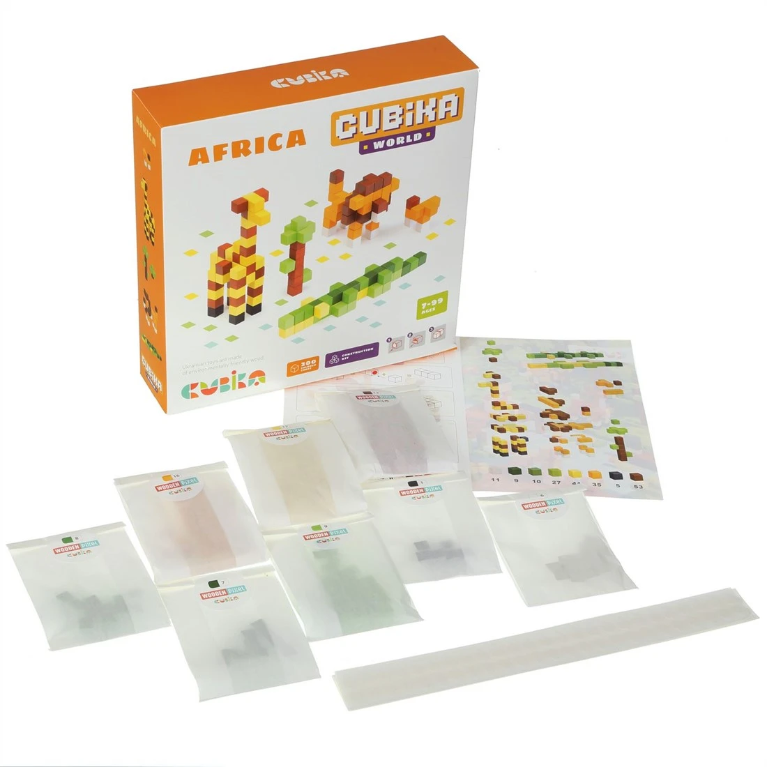 Mache 3D-Konstruktionen aus Holzblöcken! Mit doppelseitigen Aufklebern klebst du die Holzblöcke zusammen. Hast du die Figuren fertiggestellt? Dann kannst du mit den Figuren spielen! Dieses Set steht unter dem Thema ‚Afrika‘ und enthält 200 Holzblöcke .