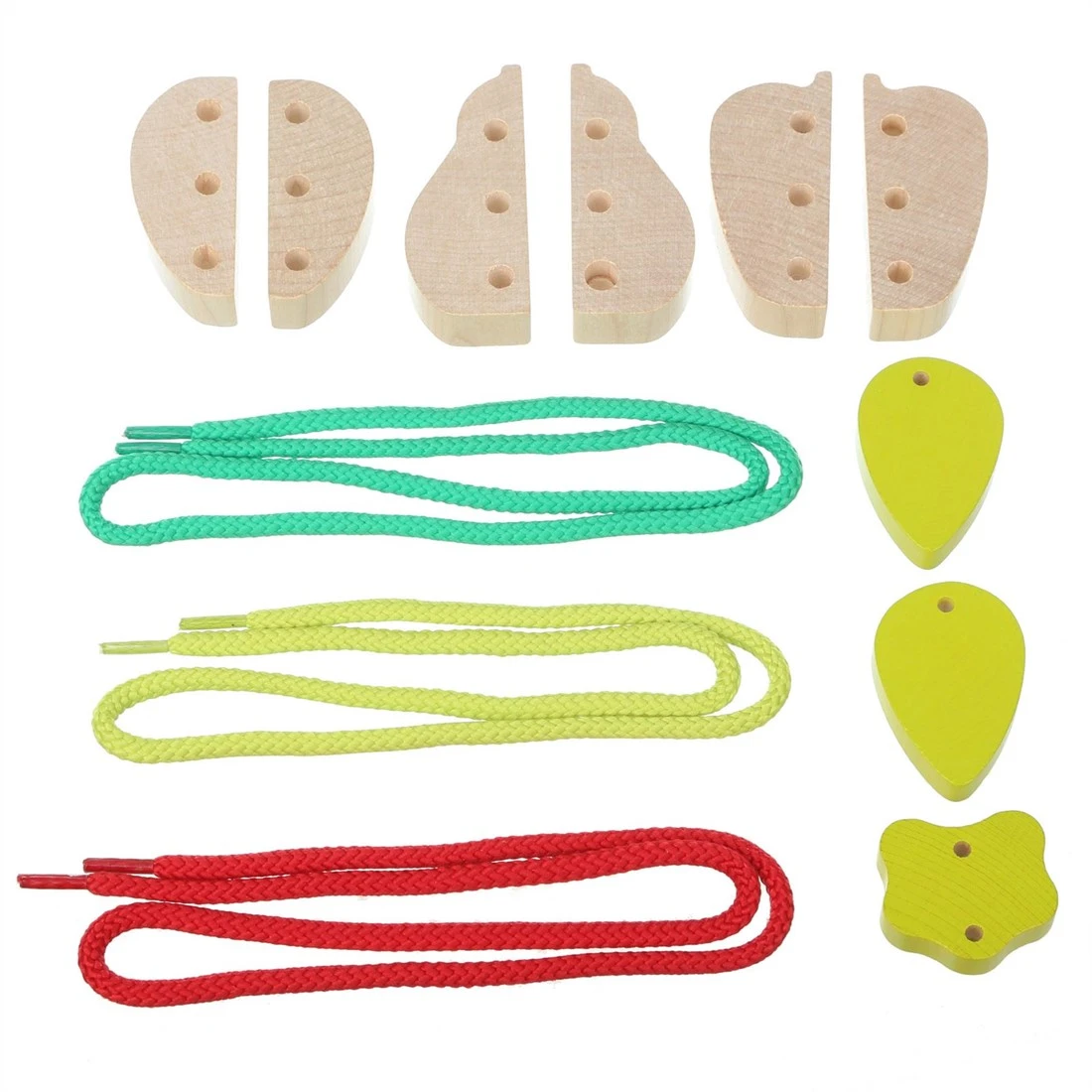 Füllen den Obstkorb, indem du alle einzelnen Holzteile aneinander fädelst! Welche Teile hören zusammen? Die Holzfiguren haben die idealen Maße füf Kinderhände und wurden mit gift-freier Farbe lackiert. Dieses Fädelspiel stimuliert die Entwicklung der Feinmotorik und des logischen Denkens.