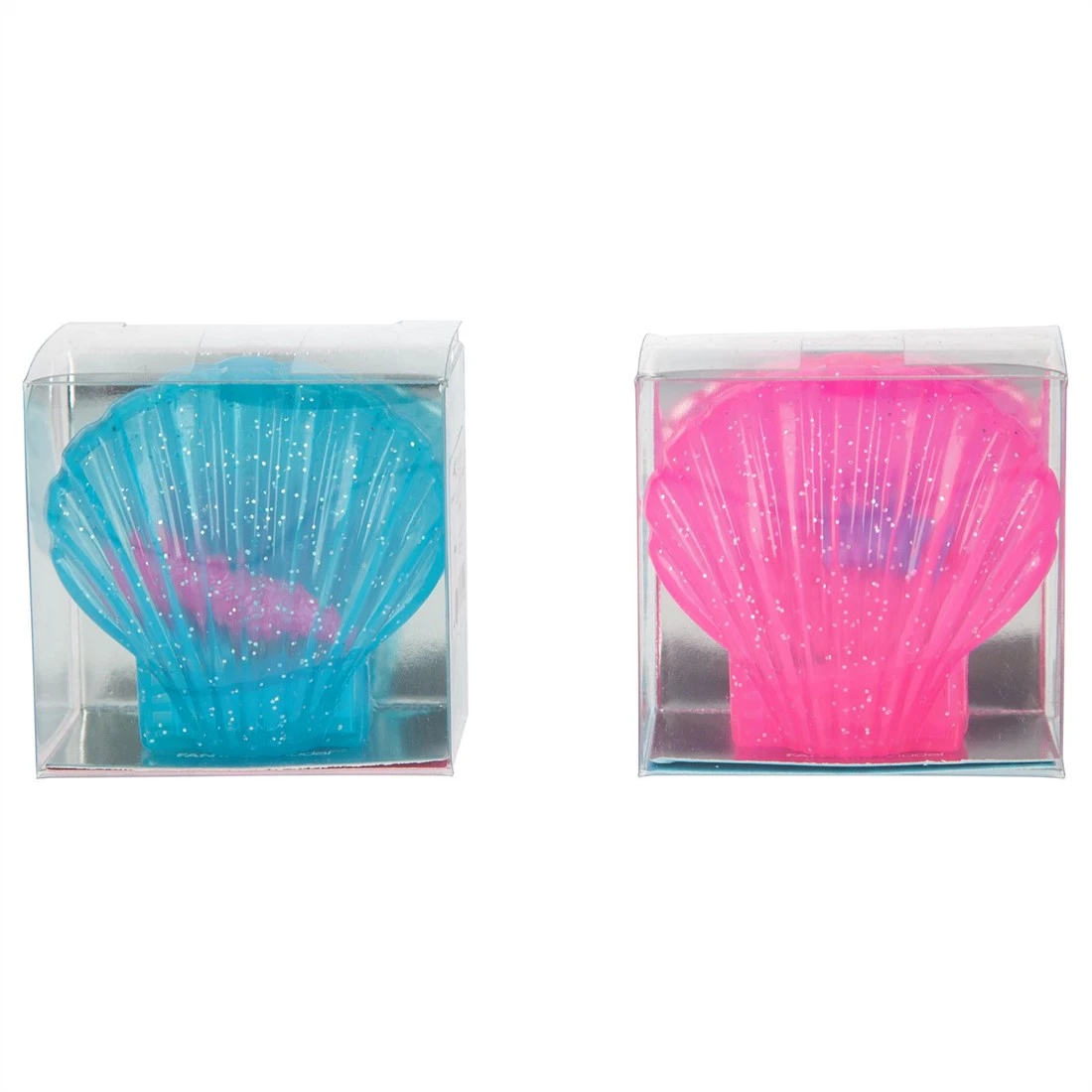 Voll im Meerjungfrauen Trend – Radierer geformt wie eine Perle, Meerjungfrau & Seestern, verpackt in muschelförmiger, glitzernder Anspitzerbox.