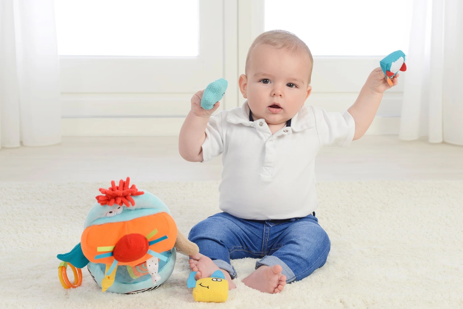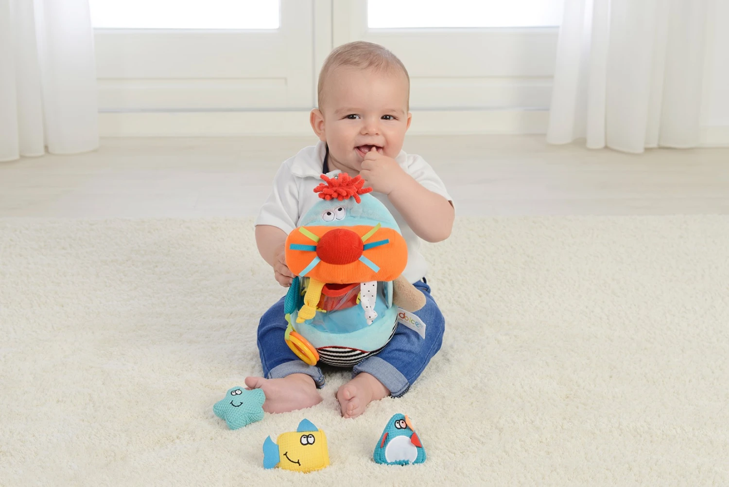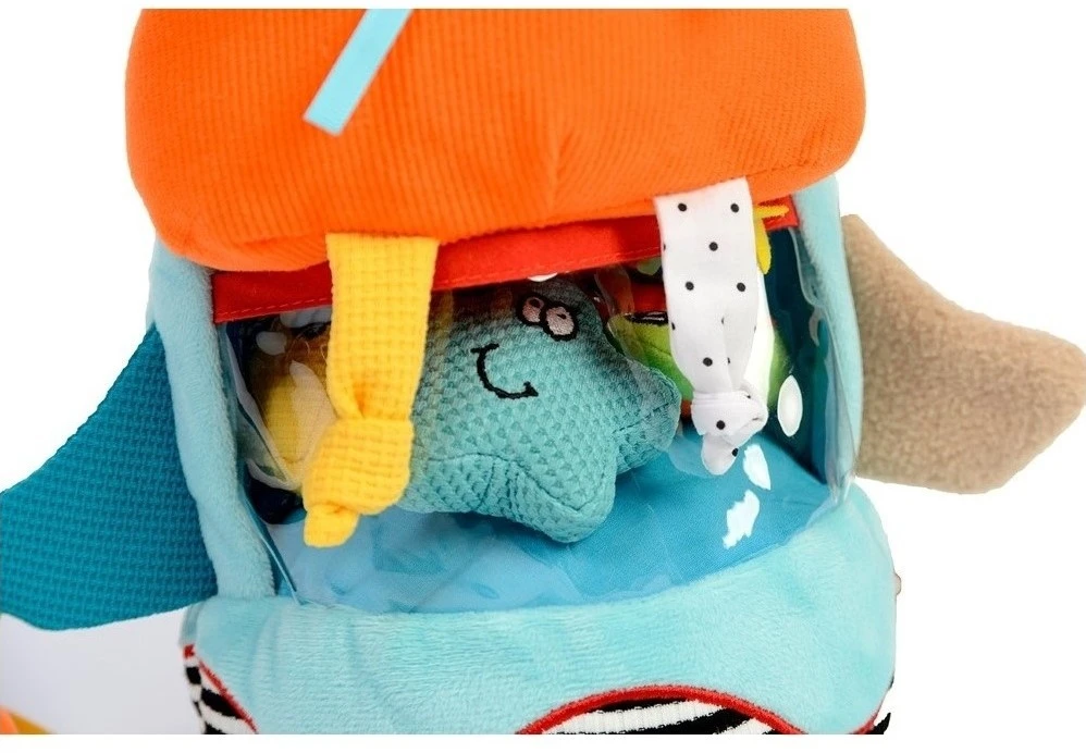 Dieses lustige Walross mit verschiedenen Strukturen trägt fünf Meerestiere: eine Krabbe, einen Fisch, einen Seestern, eine Schnecke und einen Pinguin. Alle Figuren können in den Mund von Walter dem Walross gesteckt werden. Das Walross und seine Freunde haben viele lustige Funktionen, mit denen sie spielen können – Pieptöne, Rasseln, Anhänger, Knistern und vieles mehr. Maße: 20 x 26 x 30 cm (L x B x H). Geeignet von Geburt an.