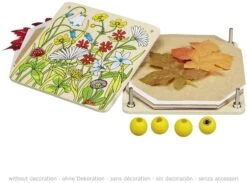 Hura, hura, der Herbst ist da. Mit den griffigen Schraubverschlüssen aus Holz und die Pappeinlagen lassen sich ganz einfach Blumen- und Blätterabdrücke auf Papier pressen.