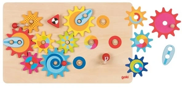 Goki Großes Zahnradspiel. Alles dreht sich alles bewegt sich. Die Richtung bestimmt das Kind und wenn alles korrekt angeordnet ist, tritt auch tatsächlich alles so ein, wie es geplant wurde. Das Umsetzen und Antreiben durch Zahnräder hat schon Generationen von Kindern große Freude bereitet. Bei diesem Zahnradspiel bekommt der Spaß durch die bewusst unterstützende Farbigkeit noch einen zusätzlichen Anschub.