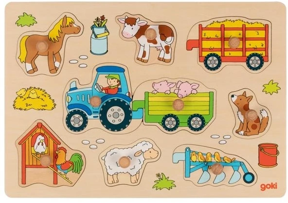 Goki Steckpuzzle Traktor mit Anhängern. Das Steckpuzzle mit dem besonderen Pfiff. Alle Anhänger passen zu dem Traktor und lassen sich so außerhalb des Puzzletabletts miteinander verbinden. Manchmal sind es halt die kleinen, durchdachten Dinge, die den Spielspaß steigern.