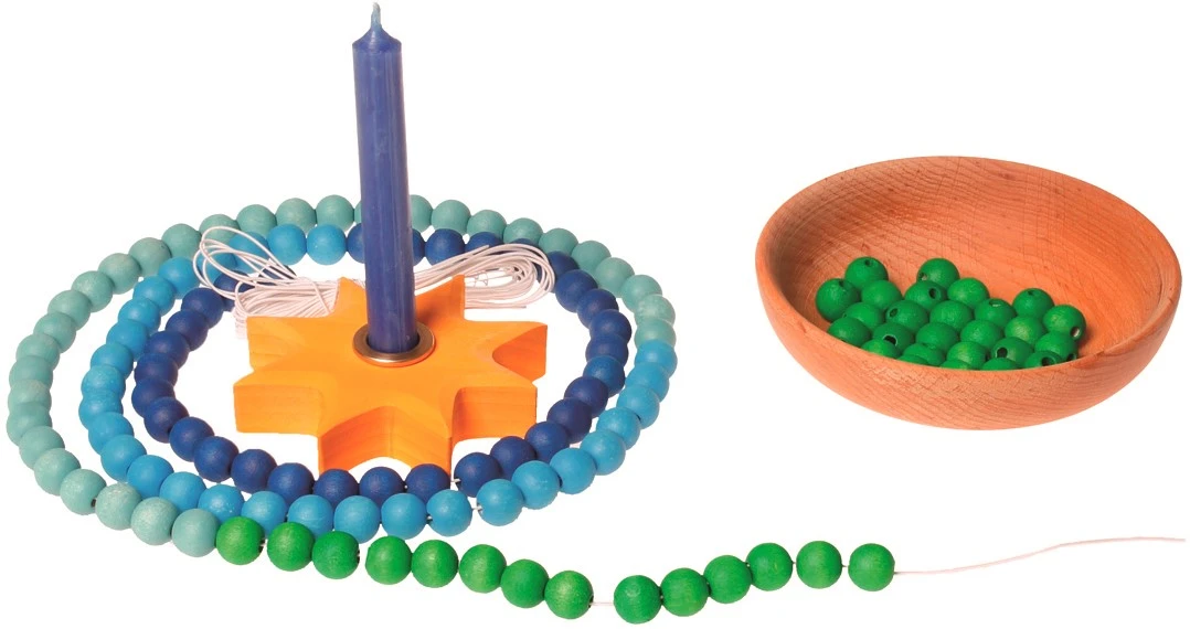 Dieses Set ist auch sehr schön als Jahreskette: Jeden Tag wird eine neue Holzperle aufgefädelt, wobei jedem Monat eine bestimmte Farbe zugeordnet ist. Auf diesem Weg können Kinder erfahren und »begreifen« was ein Jahr, ein Monat oder auch ein Tag ist. Sie entwickeln dadurch leichter ein Gefühl für größere Zeiträume.
