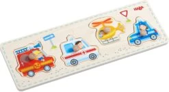Tatütata! Womit sausen Feuerwehr, Sanitäter oder Polizei zu ihrem Einsatzort? Mit diesem hochwertigen Greifpuzzle lernen schon die Kleinsten spielerisch die verschiedenen Einsatzfahrzeuge kennen. Für schnelle Puzzle-Erfolge sorgen die großen Holzteile mit griffigen Knöpfen.