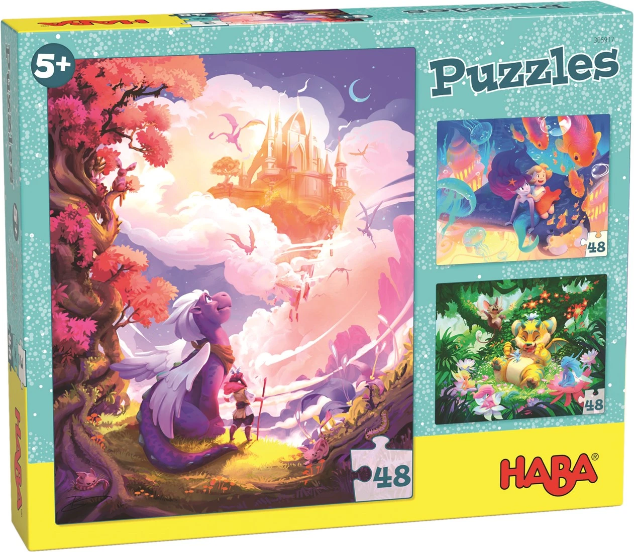 HABA Puzzle Im Fantasieland. Für diejenigen, die schon immer einmal die wunderbaren Wesen im Fantasieland kennenlernen wollten, geht nun ein Traum in Erfüllung. Denn mit jeweils 48 Puzzleteilen tauchen die Kinder in drei faszinierende Welten ein und entfalten so ihre fantasievolle Seite. Hier können sie mit dem freundlichen Drachen zu dem magischen Schloss in den Wolken fliegen, mit der quirligen Meerjungfrau und anderen Meeresbewohnern auf einem Rochen durch den gigantischen Ozean gleiten oder mit dem putzigen Tiger und seinen außergewöhnlichen Elfenfreunden spielen. Alle Puzzleteile sind aus stabiler Pappe verarbeitet, wodurch langer Spielspaß garantiert ist.