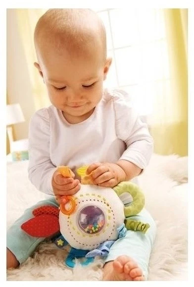 Egal, ob Beißelement, Spiegel, Rassel oder Glöckchen – hier ist alles, was Babys Spaß macht, immer an Bord. Und dazu ist dieses Spielkissen noch so schön regenbogenbunt und, dreht man es um, kuschlig weich.