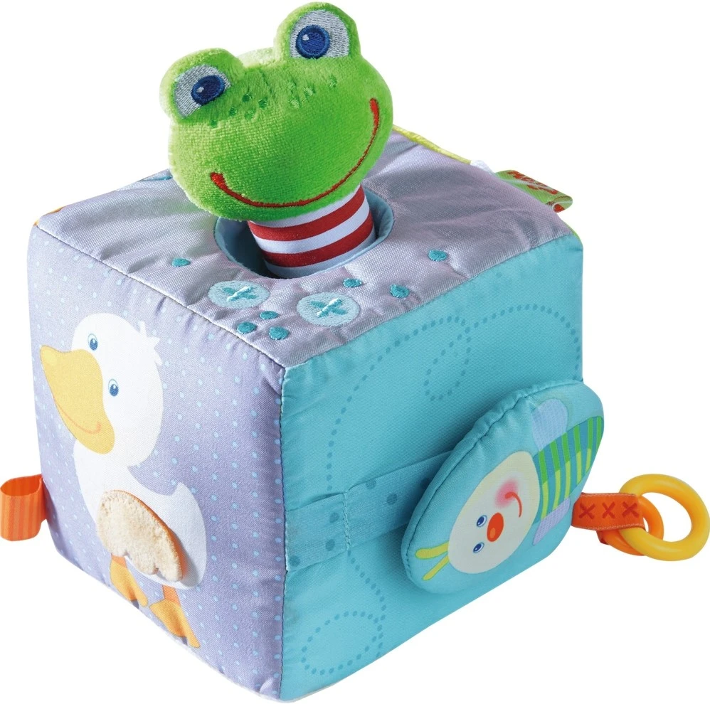 Der HABA-Spielwürfel Zauberfrosch hält viele Überraschungen parat: Der kecke Frosch ist überall – mal versteckt er sich hinter Knisterblättern, mal macht er eine Tour mit der Ente im Auto mit drehbaren Rädern und mal springt er lustig zurück, wenn man ihn herauszieht und wieder loslässt. Auch seine Freunde verbreiten gute Laune: Die niedliche Raupe lässt sich hin- und herschieben und die Ente quietscht lustig, wenn man ihren Bauch drückt. Beim Ertasten und Erkunden trainieren schon die Kleinsten spielerisch ihre Feinmotorik. Der Spielwürfel Zauberfrosch ist sowohl zuhause als auch unterwegs ein einfallsreicher Zeitvertreib für Weltentdecker ab 6 Monaten.