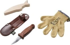 1 Schnitzhandschuh (passend für Kinder zwischen 6 und 10 Jahren), 1 Schnitzmesser, 1 Rohling Sardine.