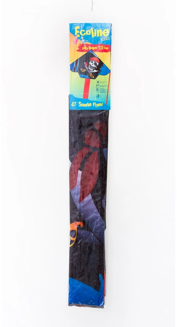 Ecoline 102146 – Simple Flyer Jolly Roger 120cm Kinderdrachen Einleiner, ab 5 Jahren, 75x120cm und 1.5m Drachenschwanz, inkl. 17kp Polyesterschnur 25m auf Griff, 2-5 Beaufort