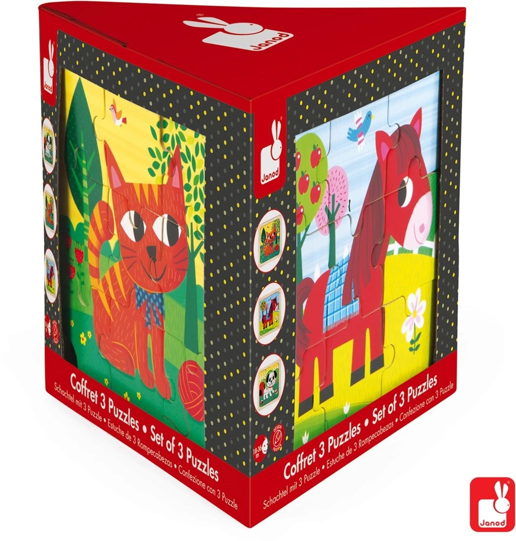 Puzzlespiel. Set aus 3 Puzzles. Aus Karton. Jeweils 9 Teile. Geeignet für Kinder von 18-36 Monaten. Die drei Motive Pferd Tornado, Hund Titus und Katze Felix in einem Set. Abmaßungen: 20 x 1 x 20 cm.