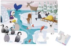 Puzzle mit 20 Teilen. Motiv: Die Tierwelt im Eis. Besonderer Spielwert aufgrund teilweise mit Stoffen und Materialien ausgestatteten Puzzleteile für ein besonderes haptisches Erlebnis und somit zusätzlichen Spielspaß. Abgebildet werden Pinguine, Eisbären, Huskies und auch ein Eskimo mit Iglu. Die Welt kann somit spielerisch entdeckt werden und mehrere Sinne werden angesprochen. Geeignet für Kinder im Alter von 3-6 Jahren. Verpackt im Karton.