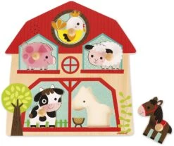 Holzspielzeug. Puzzlespiel mit Musik. 5 Puzzleteile mit fingergerechten Holzknöpfen zum leichten Setzen der Puzzleteile. Werden die Puzzleteile richtig eingesetzt bzw. herausgenommen, ertönt die entsprechende Tiermelodie des abgebildeten Tieres. Farbenfrohe Gestaltung rund um Tiere auf dem Bauernhof. Geeignet für Kinder von 18-36 Monate.