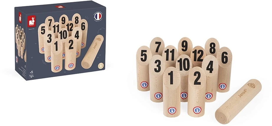Janod J03024 28 Holzkegel Spiel für draußen und im Freien-Geschicklichkeitsspiel Ab 5 Jahren