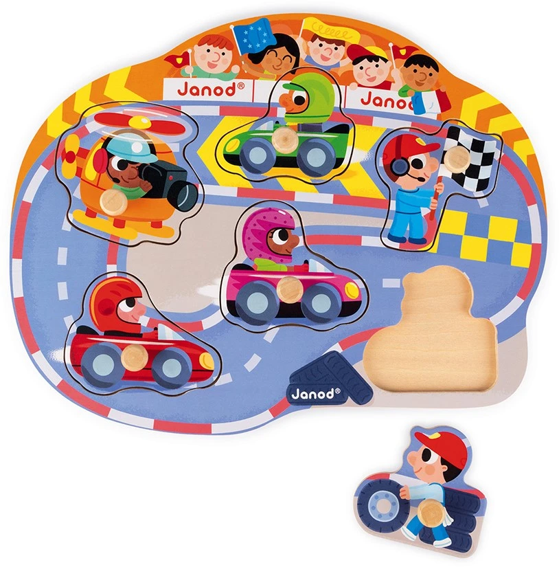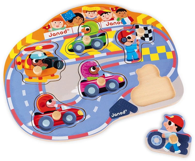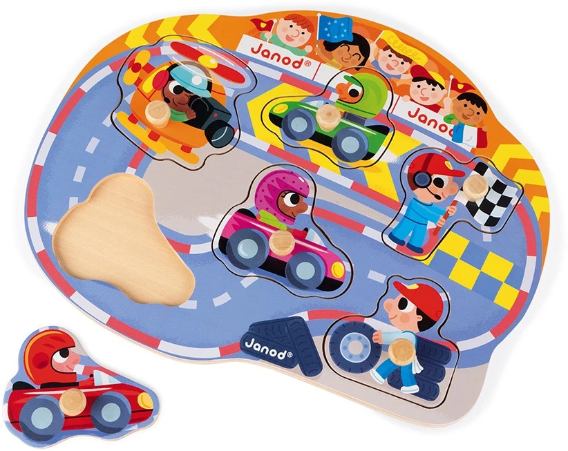 6-teiliges Puzzle mit Holzzapfen zum Thema Auto-Rennstrecke