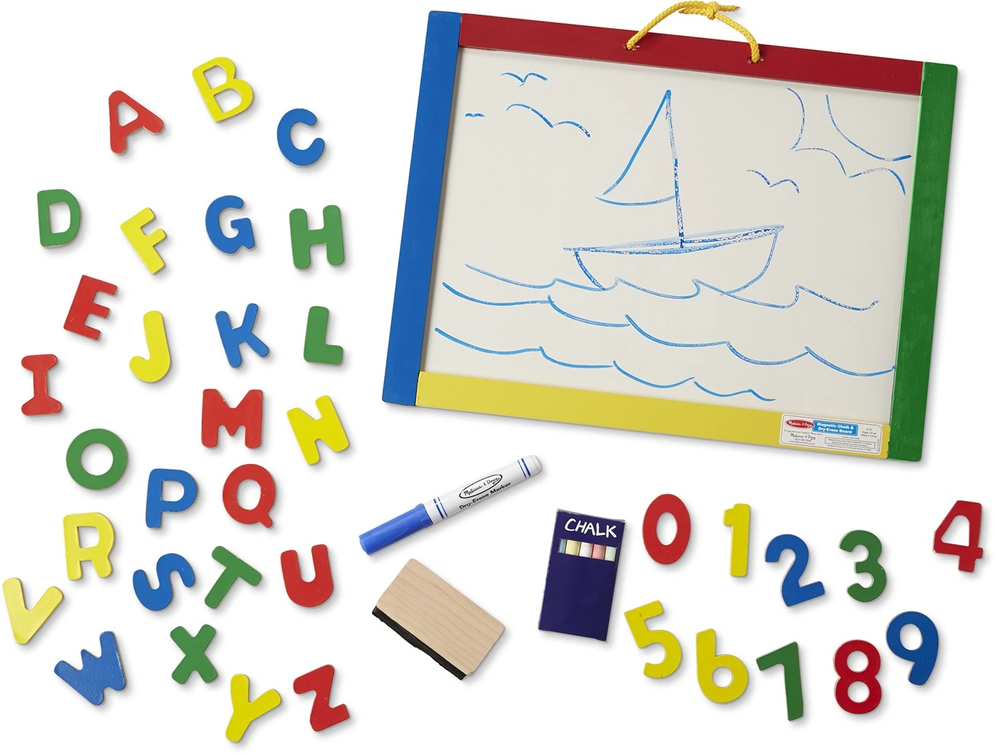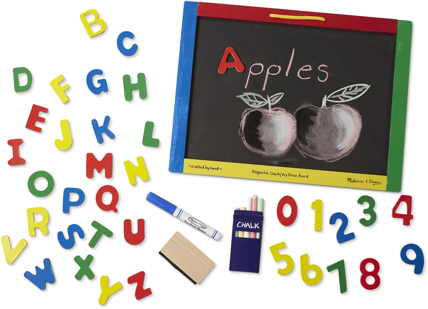 Melissa & Doug Magnetische, Trocken Abwischbare Tafel Mit Kreide Und Stift. Eine Seite ist trocken abwischbar, die andere eine magnetische Kreidetafel. Dieses tragbare Zeichenbrett kommt mit den richtigen Utensilien, um jede Lust und Laune Ihres kleinen Künstlers zum Ausdruck zu bringen! Das Set umfasst drei farbige Kreiden, einen Marker und 36 magnetische Buchstaben und Zahlen.