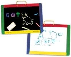 - Das doppelseitige Zeichenbrett hat einen Holzrahmen mit Tragegriff