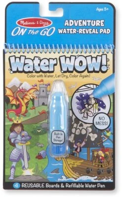 - 4 mit Spiralen gebundene Malbretter mit Abenteuer-Thematik (Unterwasser, Piraten, All und mittelalterliche Ritter) und ein auffüllbarer Wasserstift.