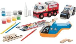 Melissa & Doug Rettungsfahrzeug-set aus holz. Die Kids werden sich fest ins Zeug legen, um mit diesem nervenkitzelnden Sortiment von drei einsatzbereiten Rettungsfahrzeugen mit drehenden Rädern und Propellern Leben zu retten. Enthält ein hölzernes Polizeiauto, ein Feuerwehrauto und einen Hubschrauber, dazu Räder, Achsen, Propeller und Ständer, sowie 8 Farbtöpfchen, 3 Pinsel, Kleber und viele Sticker mit passenden Motiven, und der Zusammenbau ist ganz einfach. Die Kids können sie alle verzieren und zur Schau stellen oder auch mit Freunden basteln — eine ideale Partyaktivität, auch etwas zum Mit-nach-Hause-Nehmen.