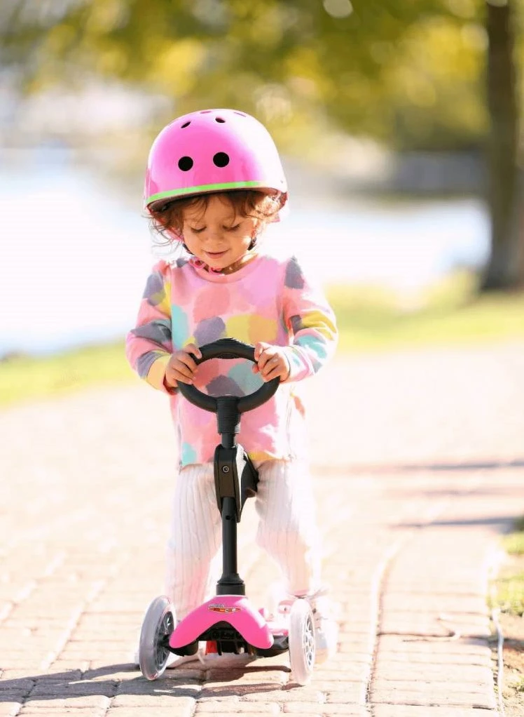 Mit dem Mini Micro 3in1 Deluxe sind die Kids bereits im Alter von 12 Monaten mobil. Was dieses Produkt auszeichnet, ist seine Multifunktionalität. Es kann in drei verschiedenen Variationen genutzt werden und begleitet den Sprössling vom ersten bis zum fünften Lebensjahr. Bei den 1-jährigen Kiddies kann der Sitz mit der neuen O-Lenkstange montiert werden. Es ist somit eine Mischung aus Laufrad und dem beliebten Mini Micro. Das Kind sitzt und bewegt sich mittels Anschubsen mit den Füssen fort, wie bei einem Laufrad. Ist das Kind sicher auf den Beinen, kann der Sitz einfach abmontiert und das Produkt wie ein herkömmliches Mini Micro benutzt werden. Zuerst mit der etwas kürzeren O-Lenkstange, später dann, ab ca. 2 Jahren, mit dem bewährten T-Lenker. Die Steuerung funktioniert über Gewichtsverlagerung und ist daher ideal für die Entwicklung der Motorik. Jetzt neu in der Deluxe Version, mit höhenverstellbarem Lenker und zusätzlichem Grip auf dem Trittbrett für noch besseren Halt.