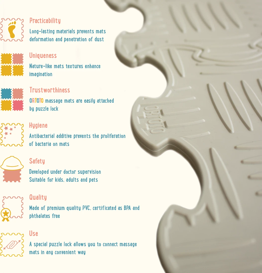Mit der speziellen Matten-Edition für die Fortgeschrittenen. Jetzt können Sie sicher sein, dass die Matten im Raum nicht mehr verrutschen! Dieses Mattenset ist speziell für eine größere Bodenabdeckung konzipiert. Die Matten können auch zusammen mit anderen Ortoto-Matten verwendet werden, oder als feste Unterlage für Ihre Sport- oder Yoga-Ausrüstung. Alles, damit Sie einen sicheren Stand haben.