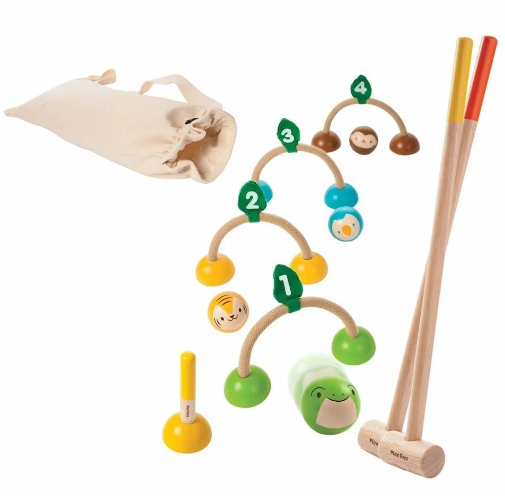 Ein beliebtes Familienspiel mit einem sehr freundlichen Design. Das farbenfrohe Krocket-Set kann drinnen und draußen gespielt werden. Das Set enthält 4 verschiedene Tierkugeln aus Holz: Vogel, Tiger, Affe und Frosch, 2 Schläger, 4 Hütchen und einen Ständer. Inklusive Tasche. Empfohlenes Alter: Ab 3 Jahren.
