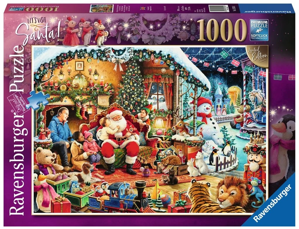 Ontsnap uit de realiteit en stap in de wereld van Ravensburger-puzzels. Deze Ravensburger puzzel van 1000 stukjes is geschikt voor zowel beginnende als ervaren puzzelaars. En omdat onze geliefde puzzels een standaard formaat hebben, kun je het resultaat inlijsten en ophangen. Dankzij de met de hand gemaakte stansmessen is de vormvariatie van de stukjes oneindig. Jong en oud zullen genieten van deze Let’s visit Santa puzzel met 1000 stukjes.