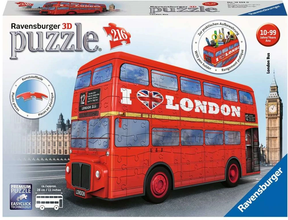 Er ist bekannt wie der sprichwörtliche bunte Hund und erfreut sich größter Beliebtheit: Der rote Doppeldeckerbus ist aus Londons Straßen nicht wegzudenken und jetzt endlich auch als 3D Puzzle Modell erhältlich. Die 216 individuell geformten Puzzleteile passen dank EasyClick Technology perfekt zusammen und formen ganz ohne Kleben ein stabiles dreidimensionales Abbild des legendären Busses. Damit ist der Puzzlespaß für London-Fans zwischen 8 und 99 Jahren vorprogrammiert – der mithilfe einer bebilderten Anleitung zur unbeschwerten Freude wird. Die 28 Zubehörteile inklusive drehbarer Räder sorgen auch nach dem Puzzeln für pures Vergnügen.