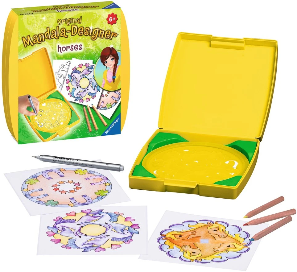 Ganz einfach Zeichnen lernen und mit den Lieblingsfarben die schönen Pferdemotive ausmalen. Das gesamte Set mit 1x Malrahmen, 1x Mandala-Schablone, 10x Bogen Papier, 1x Filzstift kann in der handlichen Kunststoffbox aufbewahrt werden. Ob im Schulranzen oder in der Reisetasche, ein Platz findet sich für den Mini Mandala-Designer immer.