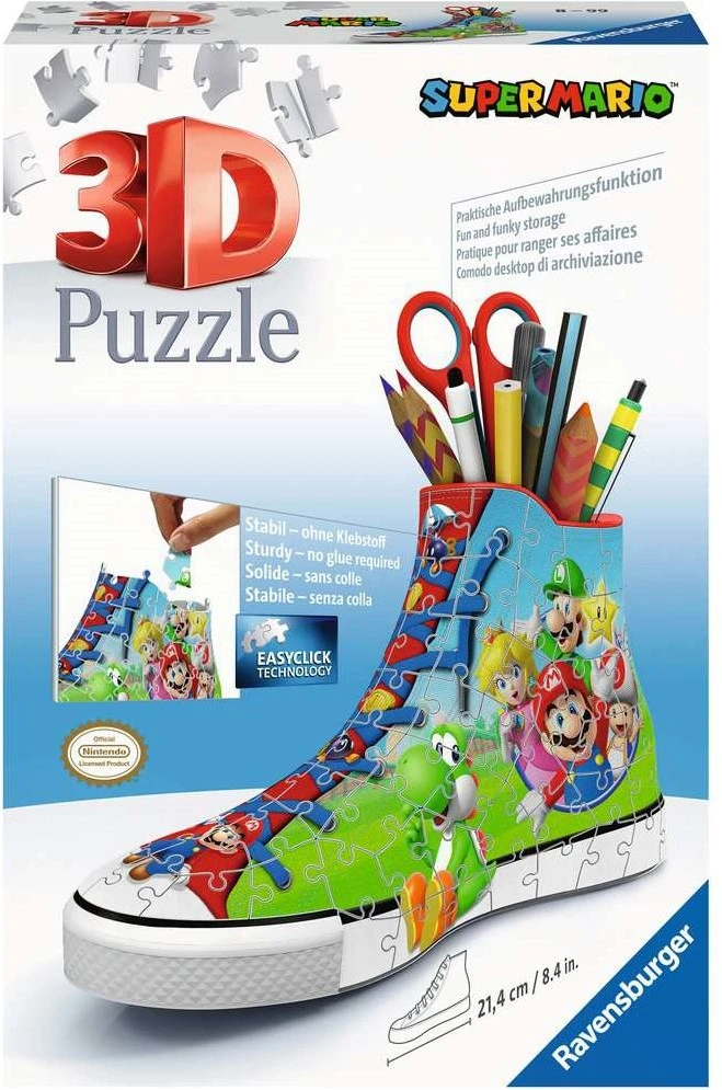 Ein 3D Puzzle, das nicht nur Puzzlespaß bietet, sondern auch gute Dienste leistet: Denn die 108 nummerierten Kunststoff-Puzzleteile und die perfekt passenden Zubehörteile können zur praktischen Aufbewahrung genutzt werden – egal ob als Stiftebox, für Scheren oder anderen Krims-Krams. Dank der bebilderten Anleitung und den Zahlen auf der Rückseite der gewölbten Puzzleteile ist das Puzzeln des Organziers kinderleicht. Auch erwachsene Super Mario-Fans haben Ihre Freude am Puzzeln und ein großartiges Dekoobjekt mit reichlich Platz für Utensilien aller Art.