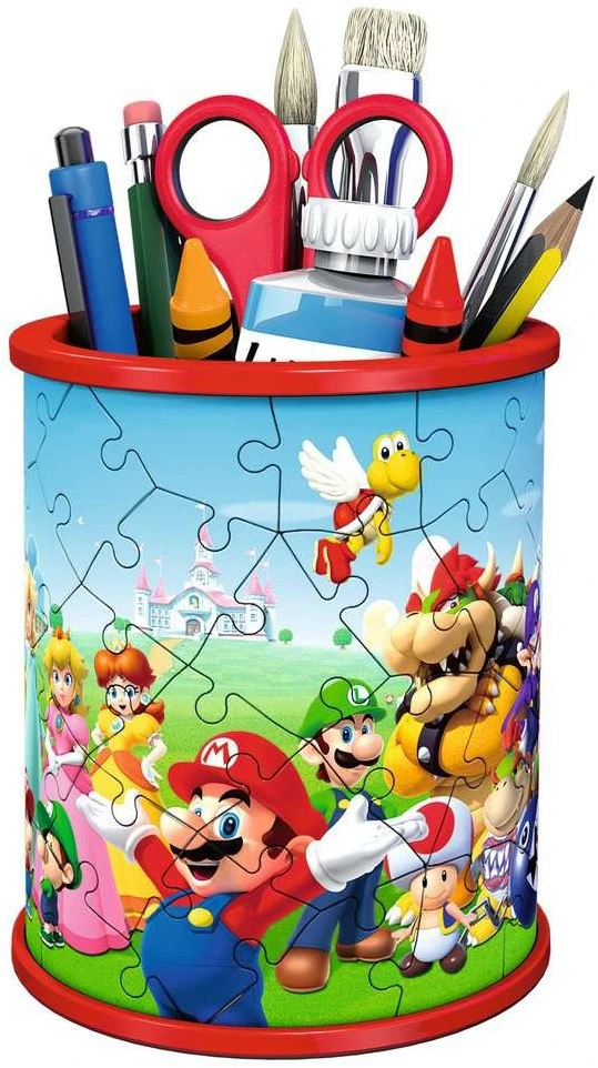 Ein 3D Puzzle, das nicht nur Puzzlespaß bietet, sondern auch gute Dienste leistet: Denn das Utensilo aus 54 nummerierten Kunststoff-Puzzleteilen kann anschließend zur praktischen Aufbewahrung genutzt werden – egal ob als Stiftebox, für kleine Schätze oder anderen Krims-Krams. Dank der bebilderten Anleitung und den Zahlen auf der Rückseite der gewölbten Puzzleteile ist das Puzzeln des Organziers kinderleicht. Auch erwachsene Super Mario-Fans haben Ihre Freude am Puzzeln und ein großartiges Dekoobjekt mit reichlich Platz für Utensilien aller Art.