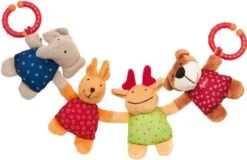 Das Neugeborene sucht vor allem Geborgenheit und Vertrauen in der neuen Umgebung. Geräusche und einfache optische Reize tragen dazu bei, dass das Baby sich mit seiner Umgebung beschäftigt. Lustig aufgereiht sind Elefant, Häschen, Elch und Bärchen. Und das Baby lauscht fasziniert den Geräuschen von Glöckchen, Rassel und Quietsche. Die Kette kann per Plastikclip an Kinderwagen oder Babyschale befestigt werden.