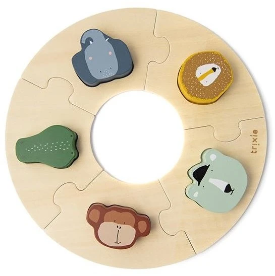 Dieses lustige Puzzle ist zwei Puzzles in einem! Zuerst muss der runde Holzring zusammengesetzt werden, um anschließend die Tierköpfe in die richtigen Felder stecken zu können. Die Puzzlestücke haben die ideale Größe und Form für kleine Kinderhände, so dass Ihr Kleines sie gut greifen und halten kann. Dieses Puzzle verspricht eine Menge Spielvergnügen und fördert sowohl motorische als auch kognitive Fähigkeiten. Die Kleinen lernen alles über Farben, Formen und Tiere und haben dabei den allergrößten Spaß.